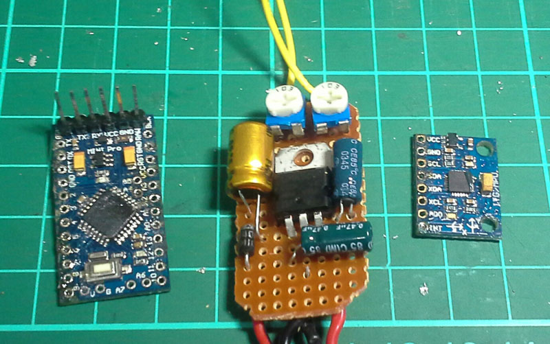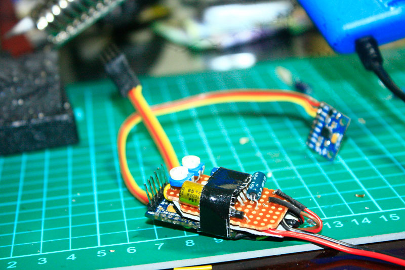 After you have the power regulator unit, next phase is to connect between Power Regulator, Arduino Mini pro, Gyro+Acclero Sensor and Servos.